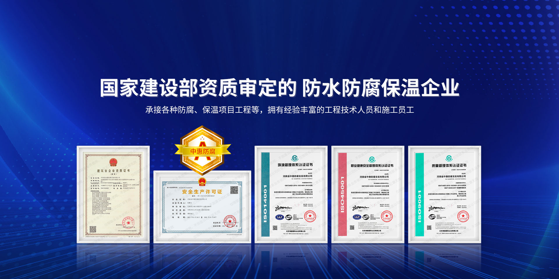 公司經營范圍:防水防腐保溫工程;消防設施工程;建筑裝修裝飾工程;建筑機電安裝工程;電力工程;建筑工程;石油化工工程;工業清洗工程;油罐清洗工程;鋼結構工程;環保工程;模板腳手架工程;電纜防火封堵、防污閃噴涂、外墻外保溫工程;各類施工勞務作業;設備維修、船舶鉚焊、涂裝;電力工程材料、建材、防水材料、防火材料、防腐保溫材料銷售,并相繼通過了GB/T19001-2008idtISO9001:2008GB/T50430-2007質量管理體系認證證書。GB/T24001-2004idtISO14001:2004環境管理體系認證證書。GB/T28001-2011idtOHSAS18001:2007職業健康安全管理體系認證證書。公司是中國防腐蝕于防護協會、中國施工企業管理協會、電力協會和中國鋼結構防水協會會員單位。 公司的經營業務涵蓋了石油、化工、電力、冶金、煤炭、船舶、國防、燃氣、水利、環保、交通運輸、航空及國防軍工和輕紡市政等行業的防腐保溫絕熱設備。鋼結構安裝、防火、防水、金屬噴鍍、聚脲噴繪、陰極保護、防滲透堵漏、玻璃鋼及各種磚版材料襯里、橡膠襯里、煙氣硫和耐酸溶劑腐蝕等工程施工。公司連續十年榮獲“省市先進施工企業”“安全生產先進單位”“重合同,守信用企業”和“AA***資質企業”的稱號。2000年被命名為市級文明單位,2002年被國家工商行政管理局命名為“重合同,守信用的企業”、被中國工業防腐蝕技術協會命名為“防腐蝕企業,能源節約及環境保護領域有豐富的經驗和***的業績。工程一次交驗合格率100%。其中攀枝花鋼鐵公司煉鐵廠四號高爐及熱風爐防腐工程、上海寶鋼公司煤氣柜防腐工程、撫順石油一廠裝置防腐項目、齊魯石化公司稀烴廠高塔防腐工程、吉林化學工業公司煉油廠油罐防腐工程、天津石化熱電廠六號爐頂棚聯絡管保溫工程、大慶油田(太倉)力神泵業工程、中國化學工程第十一建設工程、中原油田勘探局工程、中國石化銷售有限公司華北分部、魯皖輸油管道工程、貴州開磷息烽合成氨工程、陜西黃陵煤化工程、中國石油天然氣西部管道塔里木輸油工程、邯鋼集團邯寶鋼鐵公司煉鐵工程、德州供電工程、吉寶(南通)船廠工程,偃師華潤熱力工程、鄭州熱力總公司。 河南省中惠防腐安裝有限公司愿以豐富的施工經驗,***的技術,***的設備,***的管理,***的服務,竭誠為國內外廣大的用戶提供***滿意、******的工程作品。 我公司愿與國內外同仁一道,團結協作,共同推進防腐蝕行業發展! 公司地址:河南省長垣縣建設路北段360號 固定電話:0373-8866488 郵編:453400 網址:http://www_zhff_com_cn.vrarzyw.com
